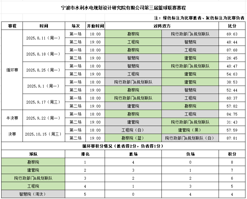 建管院隊則以3勝1負積7分的戰(zhàn)績緊隨其后,其中8月25日與工程院隊的激戰(zhàn)中,以63:54險勝對手,展現(xiàn)了頑強意志。院行政部門&規(guī)劃聯(lián)隊和工程院隊分別以2勝2負和1勝3負的成績位列第三、四名,攜手晉級半決賽。