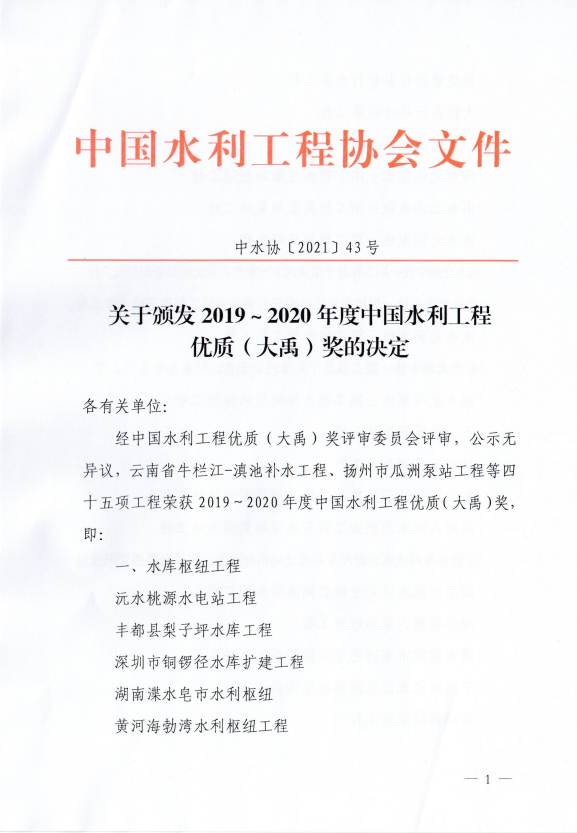 2019-2020年度中國水利工程優(yōu)質(zhì)(大禹)獎