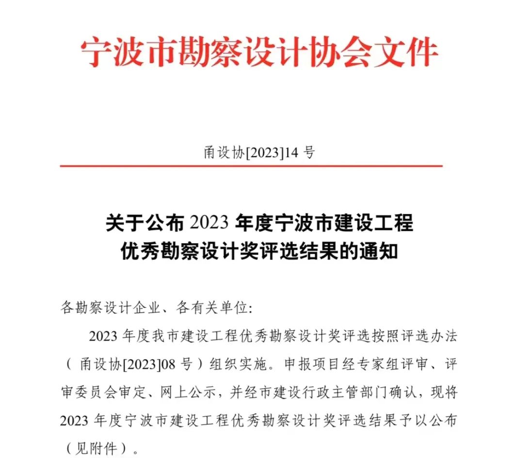 喜報(bào) | 我院兩大項(xiàng)目榮獲2023年度寧波市優(yōu)秀勘察設(shè)計(jì)獎!