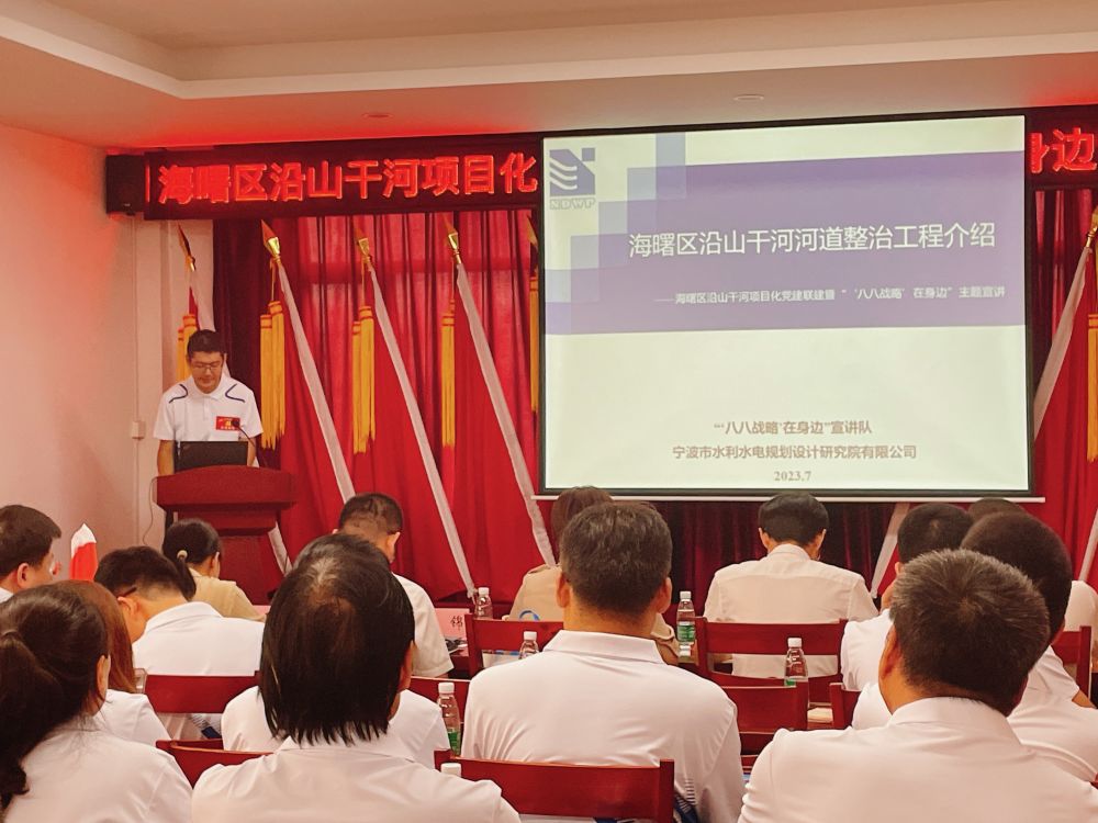 儀式結(jié)束后,新聘任的“‘八八戰(zhàn)略’在身邊”宣講隊成員之一,我院沿山干河項目組成員褚洪康,做了《海曙區(qū)沿山干河河道整治工程介紹》的匯報,標(biāo)志著項目主題宣講正式啟動。