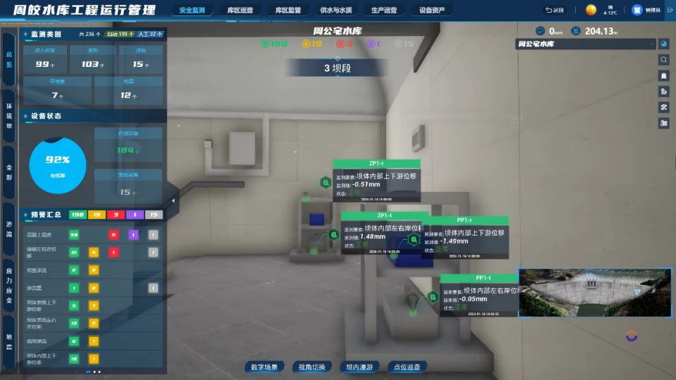 水庫(kù)大壩是流域防洪工程體系重要組成部分,是保障水安全的“重器”。數(shù)字孿生周公宅-皎口梯級(jí)水庫(kù)系統(tǒng)利用高精度模擬仿真引擎1:1構(gòu)建水庫(kù)大壩可視化模型和工程安全監(jiān)測(cè)分析模型,全面監(jiān)控、深入分析水庫(kù)環(huán)境量、變形、滲流、應(yīng)力應(yīng)變、地震等安全要素,逐時(shí)分析大壩的各項(xiàng)安全指標(biāo),直觀展示大壩的安全狀態(tài)。