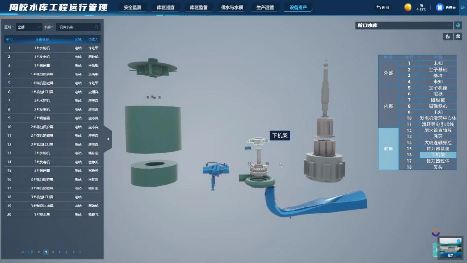 依托BIM仿真建模技術(shù),數(shù)字孿生周公宅-皎口梯級(jí)水庫(kù)系統(tǒng)實(shí)現(xiàn)了對(duì)水庫(kù)重要設(shè)備資產(chǎn)的精細(xì)管理。結(jié)合監(jiān)測(cè)監(jiān)控?cái)?shù)據(jù),實(shí)時(shí)掌握水庫(kù)防洪、供水、發(fā)電的運(yùn)行狀況,保障水庫(kù)安全高效運(yùn)行。同時(shí),利用BIM技術(shù)對(duì)水輪機(jī)、發(fā)電機(jī)等重要機(jī)電設(shè)備進(jìn)行零部件級(jí)的拆解,“再現(xiàn)”設(shè)備的內(nèi)部機(jī)構(gòu)和狀態(tài)。這一技術(shù)幫助水庫(kù)工作人員直觀、深入地了解設(shè)備的運(yùn)行原理與機(jī)制,為設(shè)備的精細(xì)管理及維修養(yǎng)護(hù)提供重要支持,也大幅提升了水庫(kù)設(shè)備管理的智能化水平。