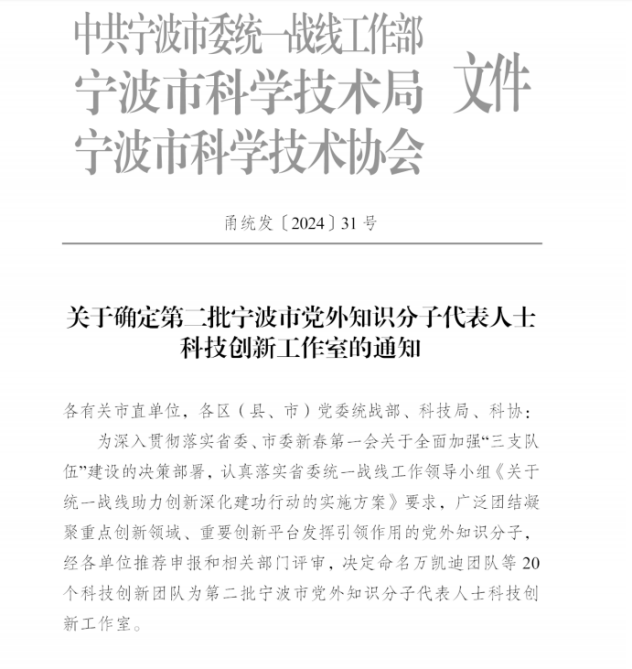近日,寧波市統(tǒng)一戰(zhàn)線助力創(chuàng)新深化建功行動啟動儀式在寧波院士中心舉行。啟動儀式上,市委常委、統(tǒng)戰(zhàn)部部長林雅蓮為第二批寧波市黨外知識分子科技創(chuàng)新工作室團(tuán)隊授牌。寧波市黨外知識分子科技創(chuàng)新工作室由市委統(tǒng)戰(zhàn)部會同市科技局、寧波市科協(xié)認(rèn)定。我院張預(yù)定創(chuàng)新工作室位列其中。