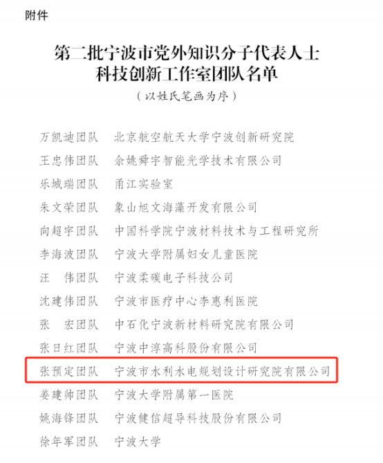 張預(yù)定創(chuàng)新工作室由我院工程院總工程師、海曙區(qū)新聯(lián)會理事、無黨派人士、河海大學(xué)研究生基地導(dǎo)師張預(yù)定領(lǐng)銜,工作室團(tuán)隊由我院工程院技術(shù)骨干組成。近年來,團(tuán)隊承擔(dān)開展省市級水利科技項目十余項,曾獲得發(fā)明專利3項、實用新型專利1項、軟件著作權(quán)2項,研究成果在多項省、市重點水利工程得以應(yīng)用。團(tuán)隊參與的寧波軌道交通4號線工程獲國家優(yōu)質(zhì)工程金獎,寧波市北侖區(qū)梅山水道抗超強(qiáng)臺風(fēng)漁業(yè)避風(fēng)錨地工程(北堤)獲中國建設(shè)工程魯班獎(國家優(yōu)質(zhì)工程),慈溪市鄭徐水庫等多個項目榮獲中國水利工程優(yōu)質(zhì)(大禹)獎、全國優(yōu)秀水利水電工程勘測設(shè)計獎等省部級獎項。張預(yù)定團(tuán)隊始終把科技創(chuàng)新貫穿于工程設(shè)計全過程,以工程帶科研,以科研創(chuàng)品質(zhì),用蓬勃的創(chuàng)新動力締造了一座又一座現(xiàn)代化水利工程。
