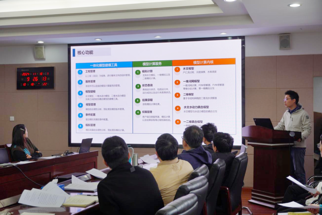 隨后,平臺研發(fā)團(tuán)隊代表陳龍贊對“澤圖水文水動力一體化模型平臺”進(jìn)行詳細(xì)介紹,并進(jìn)行現(xiàn)場實操演示。該平臺是一套我院自主研發(fā)的以組件化建模、并行化求解、在線化計算、一體化耦合、國產(chǎn)化支持為核心的水文水動力模型平臺,能夠滿足包括產(chǎn)匯流計算、水庫調(diào)度、一維河網(wǎng)、二維淹沒、水文水動力耦合、一二維水動力耦合在內(nèi)的多種模擬需求,適用于獨立部署、嵌入第三方項目等多種應(yīng)用場景。基于建模工具、模型服務(wù)、計算核心三分離的設(shè)計架構(gòu),平臺具備分布式部署、集群化管理、多節(jié)點負(fù)載均衡的動態(tài)能力,滿足靈活適用多種尺度的計算需要。
